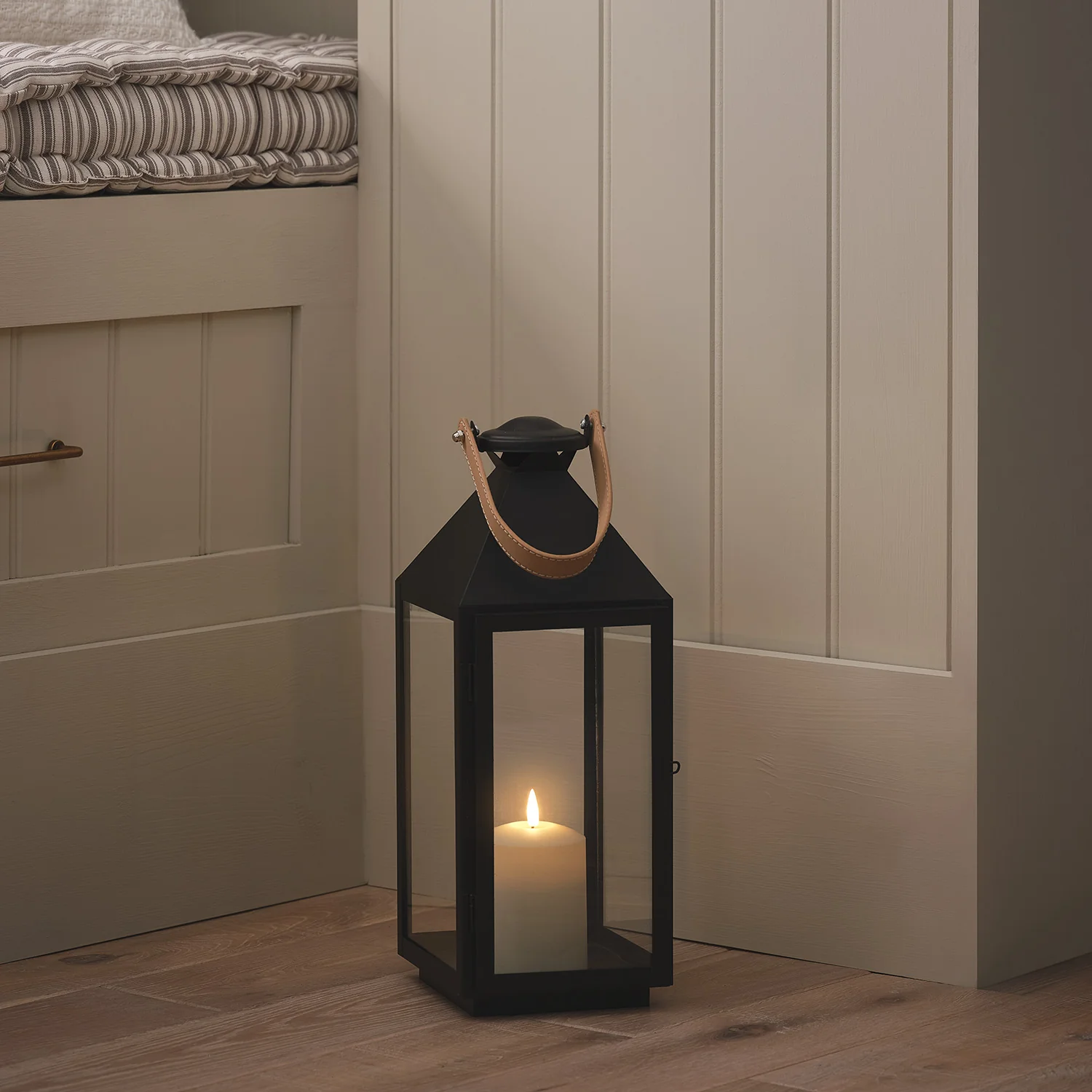 Présentées en duo, ces lanternes Brixham à anse en cuir apportent une touche lumineuse élégante à vos espaces, en intérieur comme en extérieur. Leur structure en métal noir est sublimée par une anse en cuir brun, créant un contraste chaleureux et facile à intégrer dans différents styles d’aménagement. Chaque lanterne accueille une bougie LED TruGlow® couleur ivoire, dont l’effet flamme vacillante reproduit fidèlement la lueur d’une vraie bougie. Disposées côte à côte près d’une entrée, sur un perron ou dans un salon, ces deux lanternes de tailles complémentaires permettent de structurer l’espace avec équilibre et caractère.