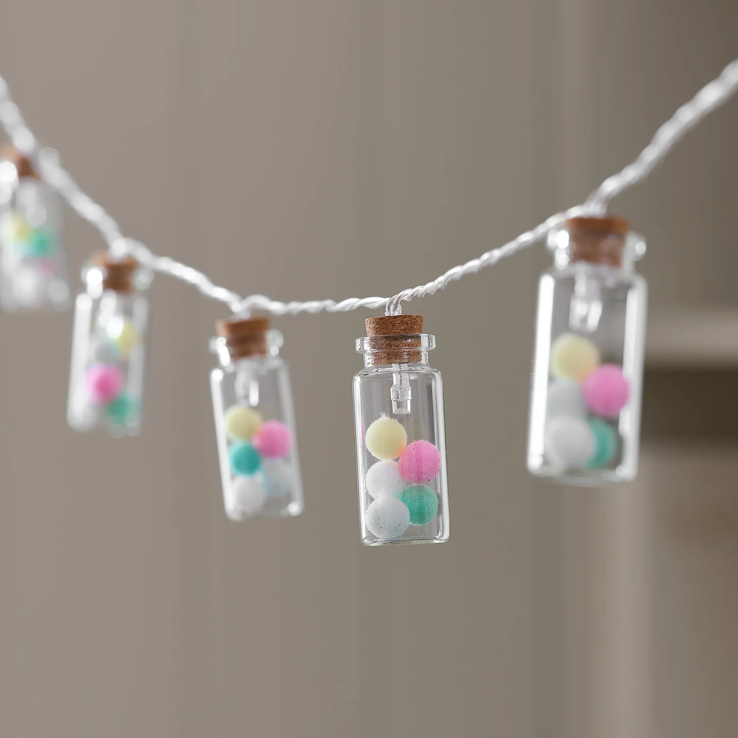 Guirlande Lumineuse à 10 LED Mini Flacons en Verre avec Pompons Pastel