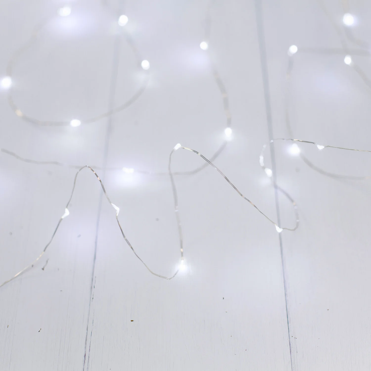 Projetez une lueur blanche froide à travers votre maison ou jardin avec notre guirlande lumineuse à piles et ses 50 micro LED blanches. || Ses micro ampoules délicates sont uniformément réparties le long d’un fil de fer argenté malléable qui mesure 4,90 mètres de long.