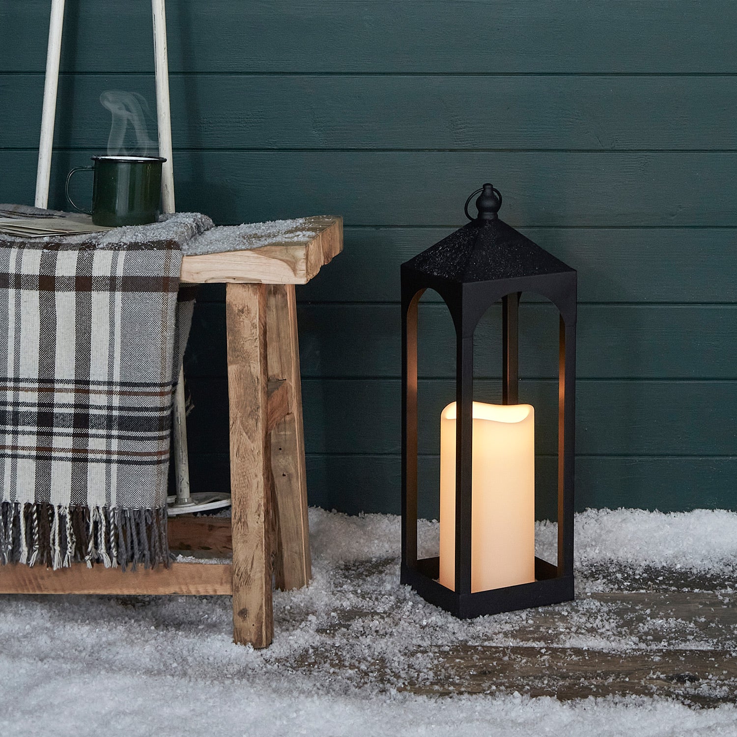 Cette lanterne est parfaite pour vos espaces extérieures avec ses finitions élégantes en couleur noire matte. || Mesurant 50 cm de hauteur, sa structure en métal n'est pas munie de panneaux, ce qui la rend encore plus résistante aux conditions météorologiques hivernales.