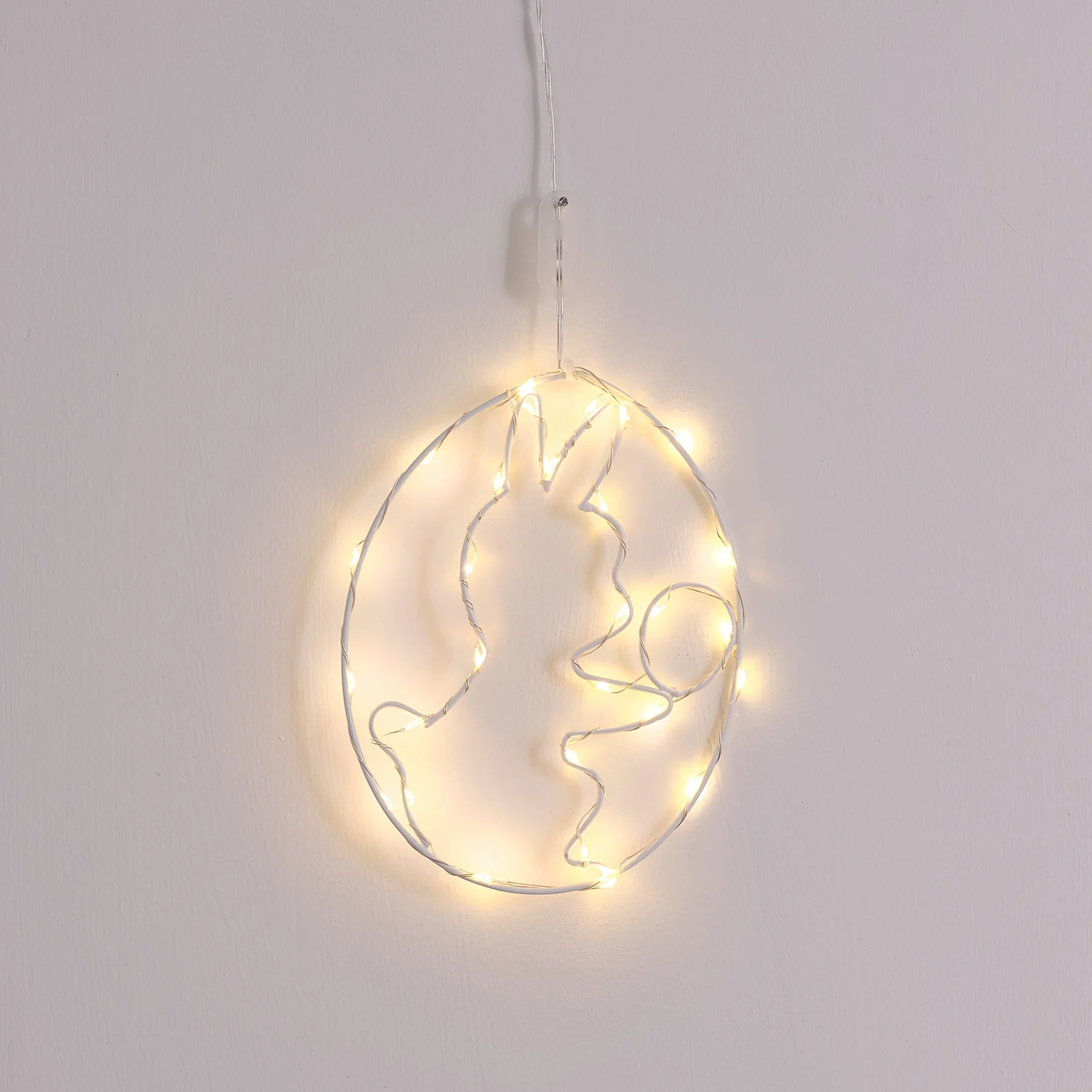 Cet œuf lumineux suspendu apportera une touche d’originalité à votre intérieur. Sa structure métallique blanche forme un contour d’œuf orné d’un petit lapin, délicatement enroulé d’un fil argenté parsemé de micro LED blanc chaud. Une boucle discrète située au sommet permet de le suspendre facilement, tandis qu’un câble transparent de 50 cm relie l’œuf à son boîtier à piles pour un affichage simple et élégant.